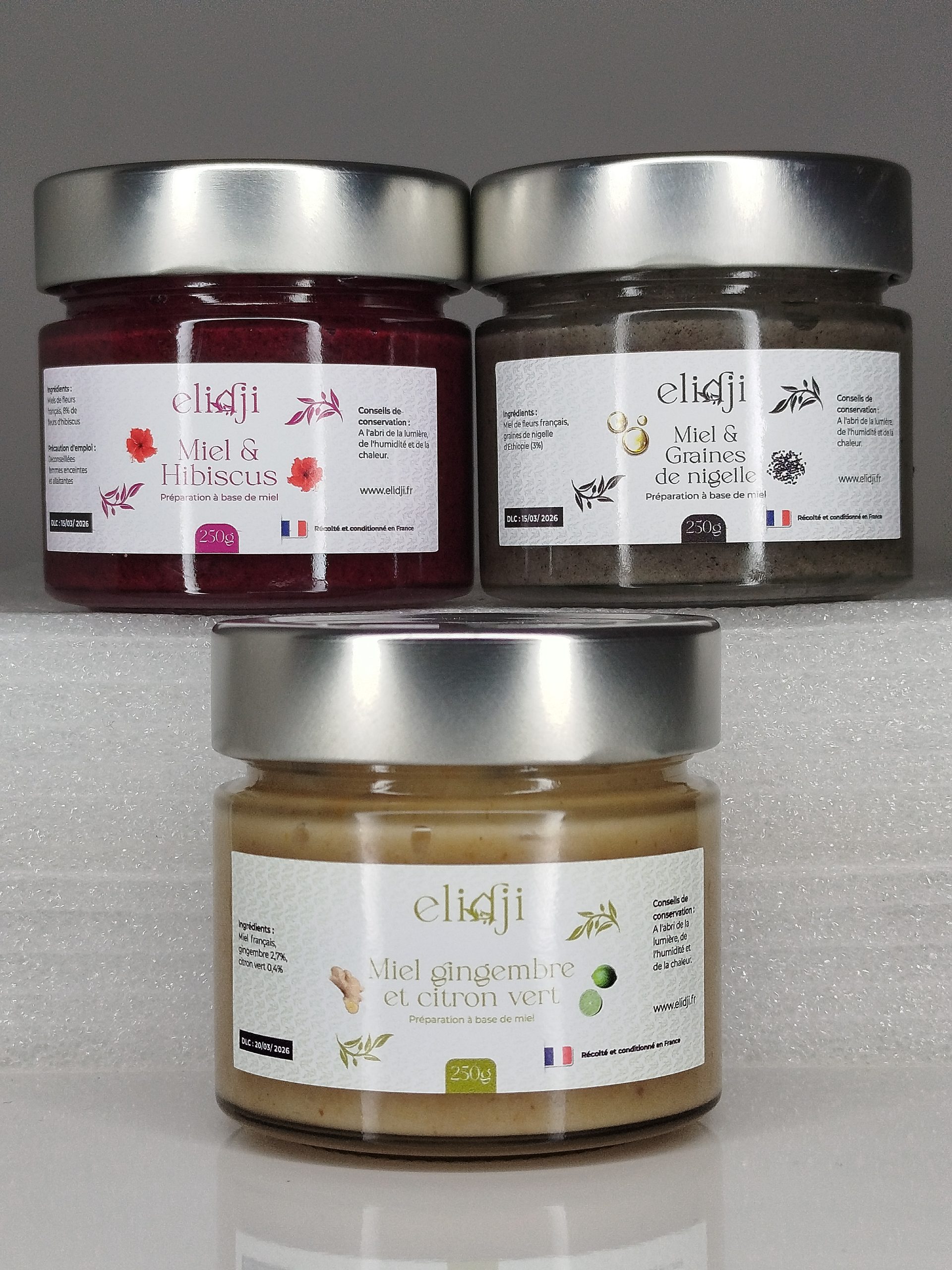 Des miels issus de l’apiculture française avec des ajouts d’ingrédients naturels rigoureusement sélectionnés.